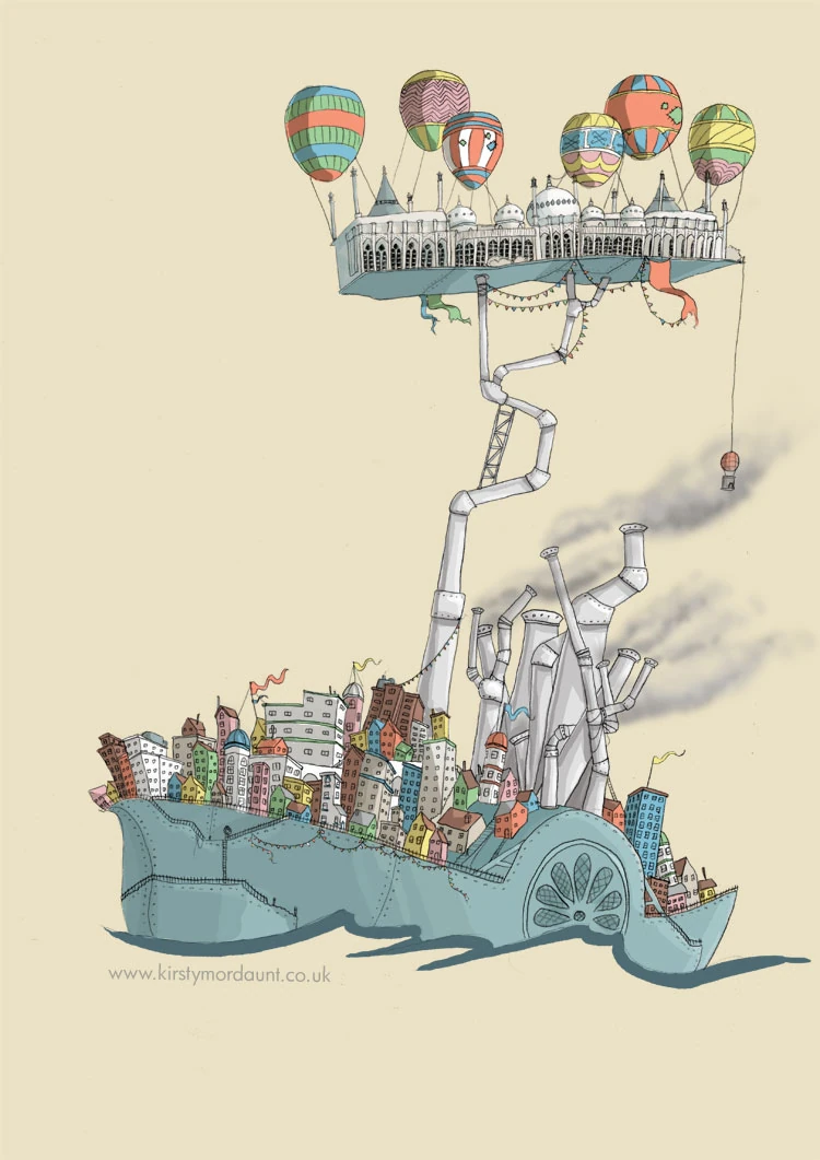 Brighton was a three-tiered raft city powered by huge paddle wheels beneath the central hub. It also had two outrigger districts which were linked to the rest of the city by large gantries. An airborne palace held up by several large gas bags called Cloud 9 was anchored a few hundred feet to the main city by thick hawsers. Cloud 9 was home to the Mayor of Brighton and included vast manicured gardens and pavilions for parties. It uses the Brightonian Dolphin.[1]